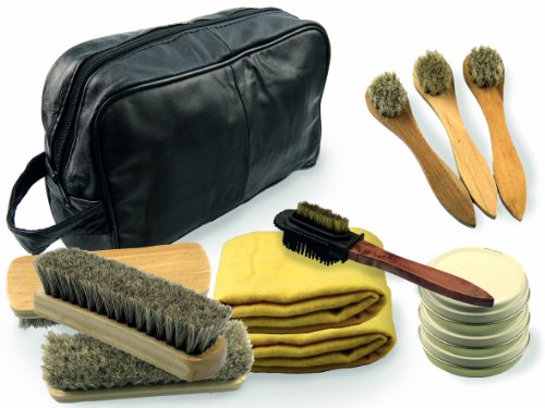 Premium shoe cleaning kit containing superior products including High density natural hair brushes (not bristle) for great polishing, top quality wax polishes to nurture the leather and give a high shine, quality dense dusters not the flimsy see-through ones, all kept in a genuine leather zip bag.